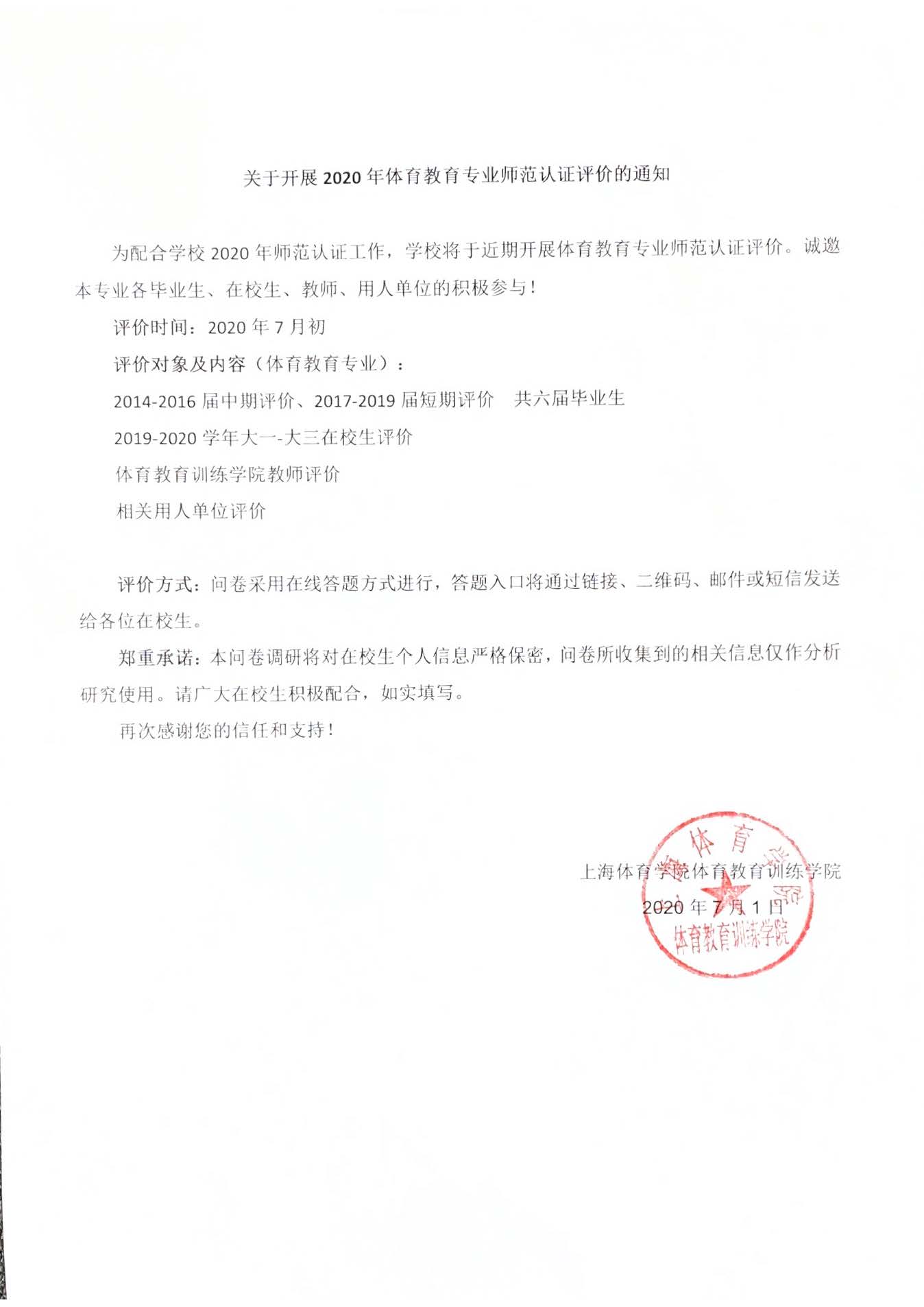 关于开展2020年体育教育专业师范认证评价的通知